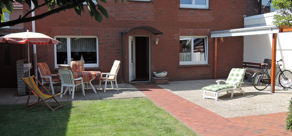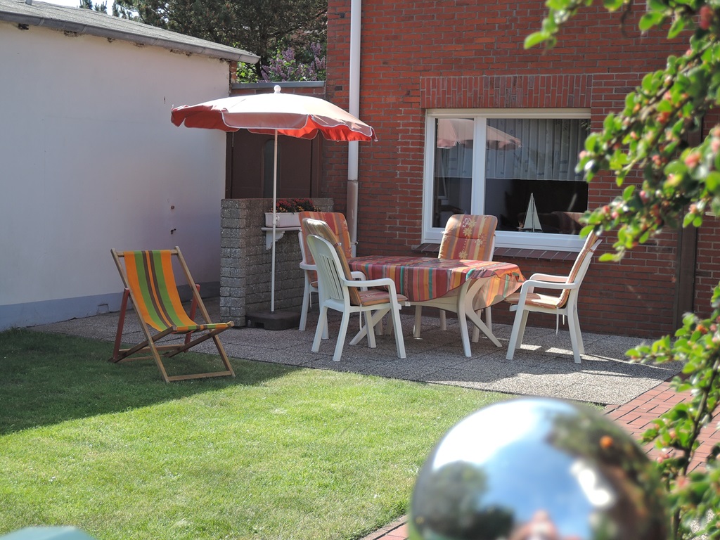 - Terrasse sowie Rasenfläche mit Gartenmöbeln
