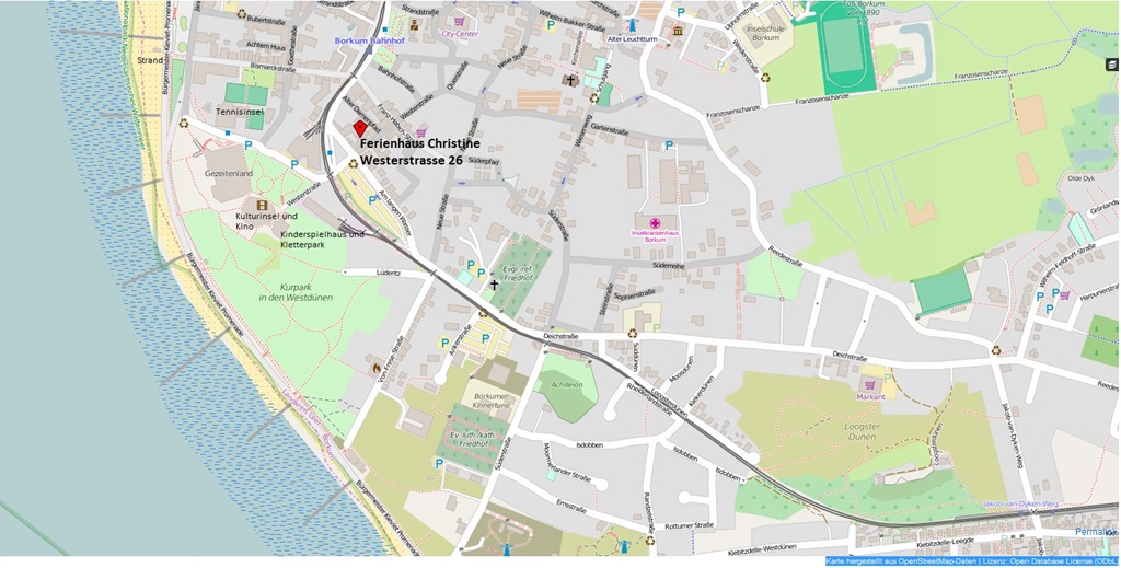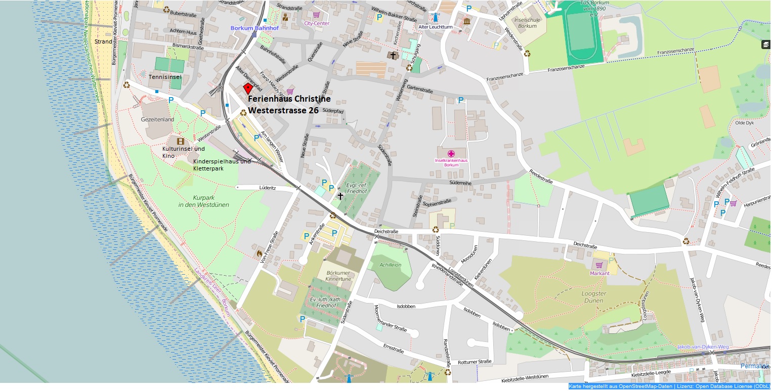 Das Ferienhaus Christine befindet sich in der Westerstraße 26. Es liegt in der verkehrsberuhigten (rote) Zone der Stadt.